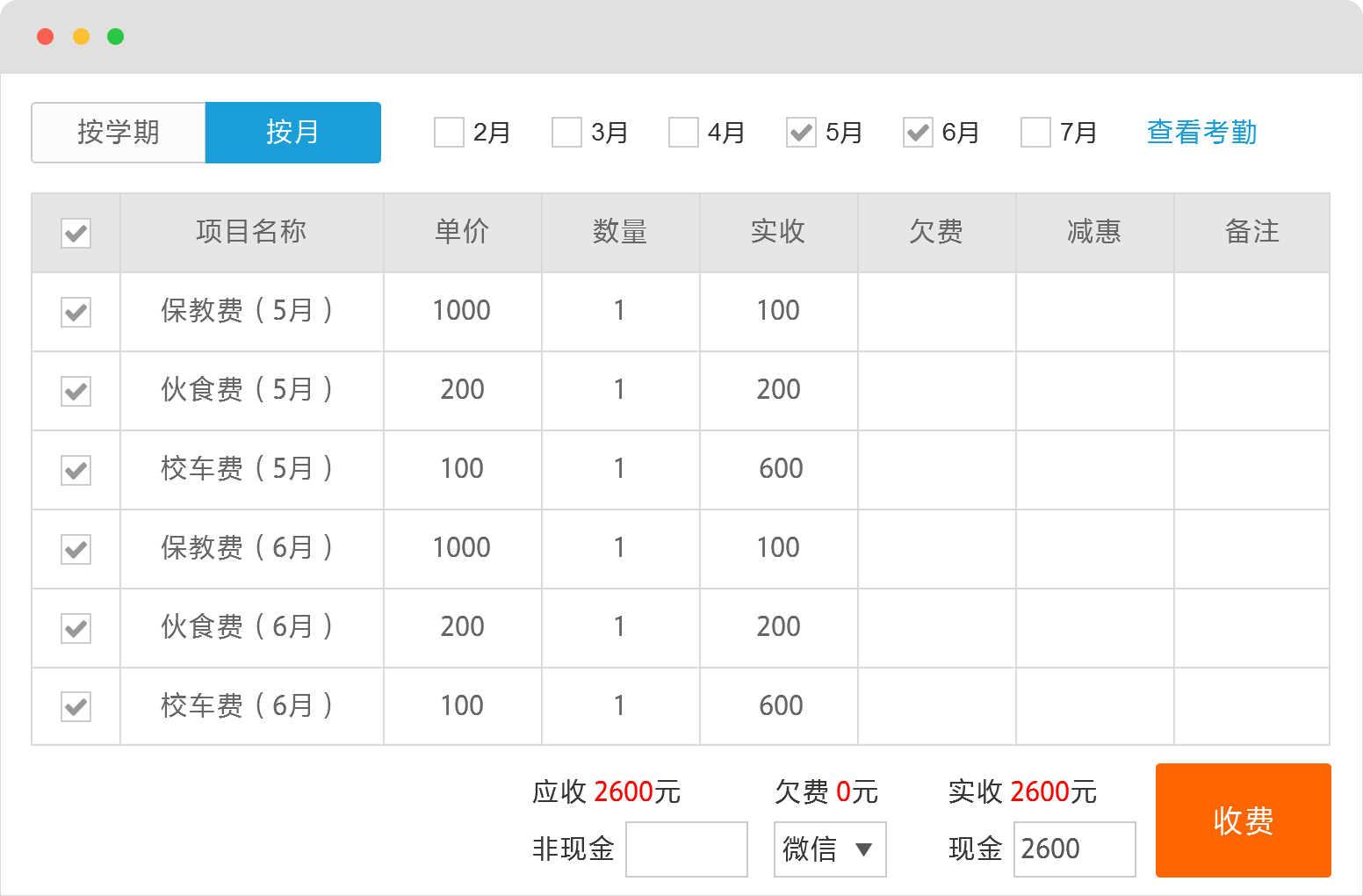 3.增强透明度:家长和幼儿园管理者都能清晰地看到收费明细和状态,增强了收费过程的透明度。